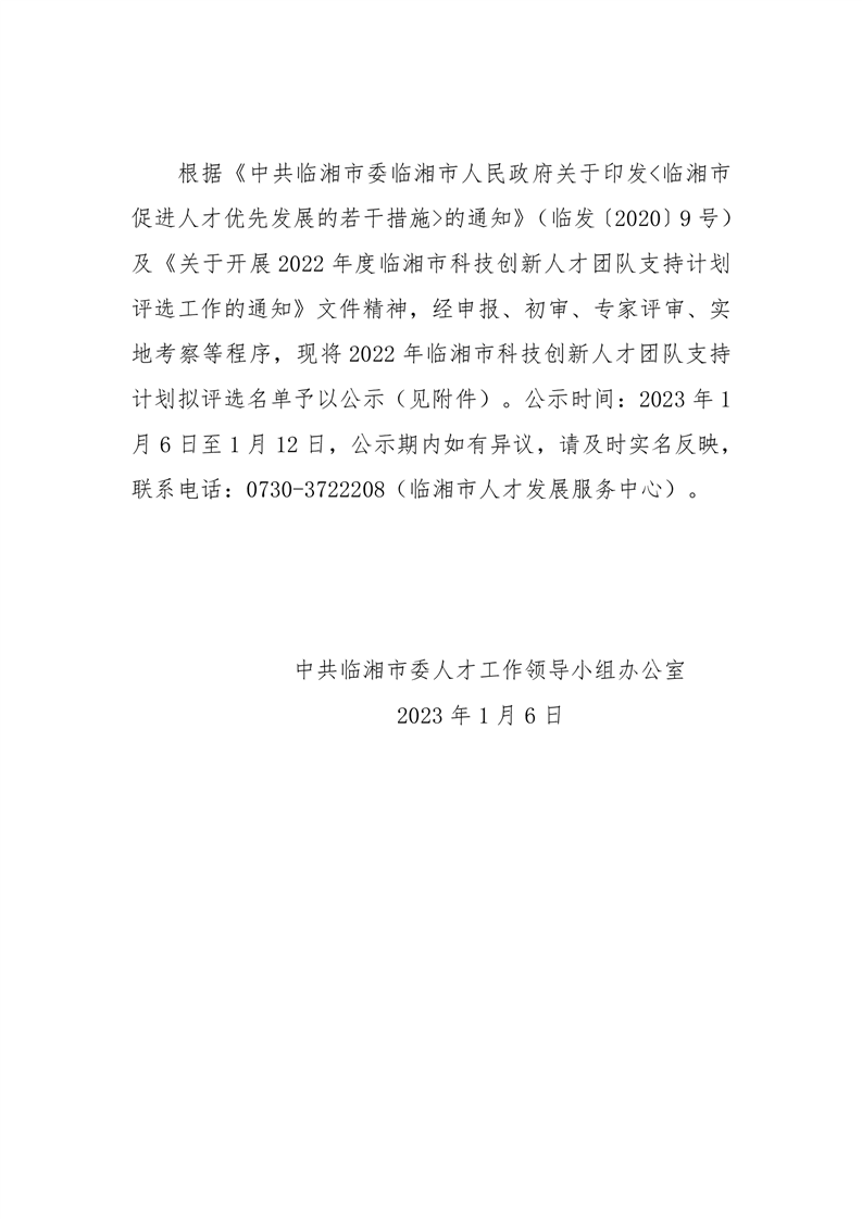 2022年临湘市科技创新人才团队支持计划拟评选名单公示