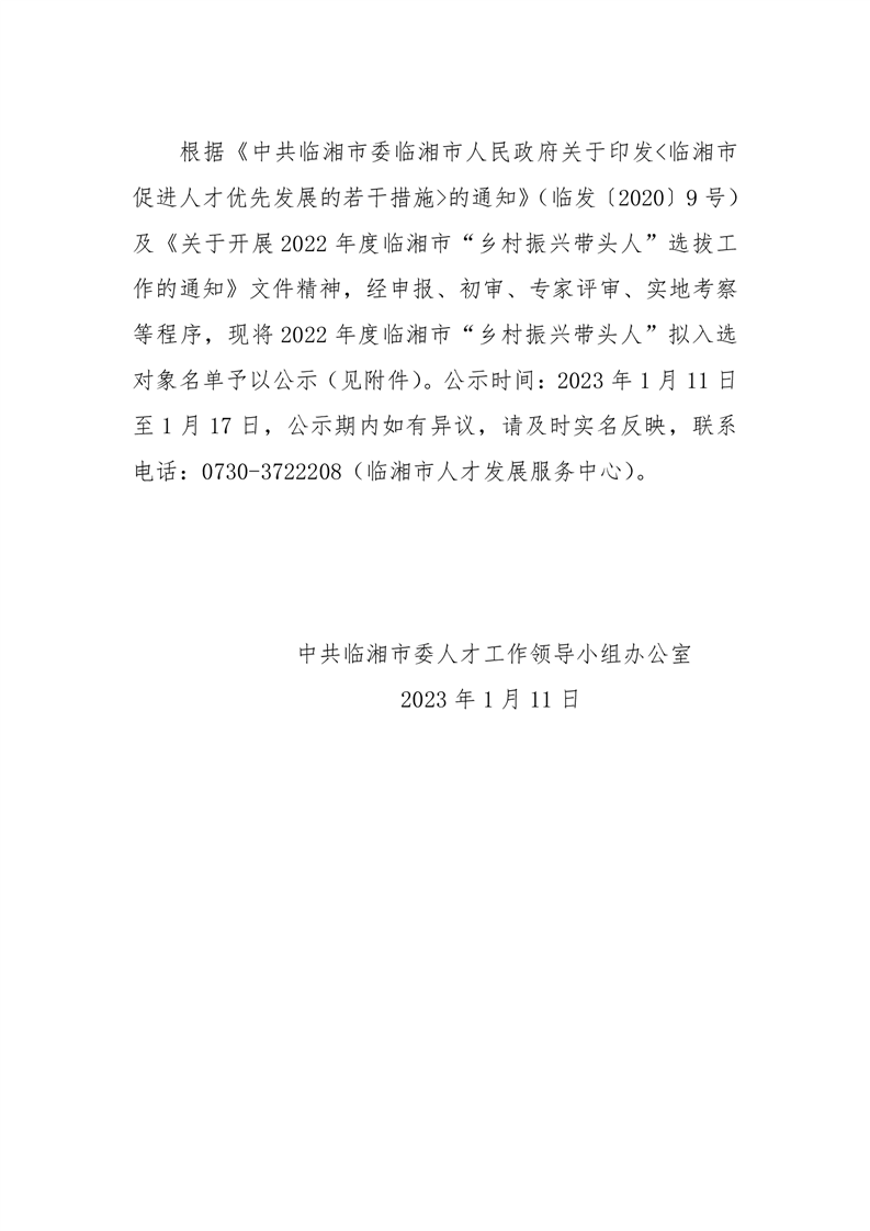2022年度临湘市“乡村振兴带头人” 拟入选对象名单公示