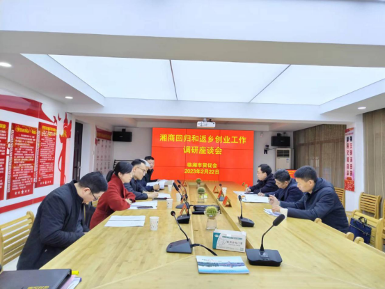 座谈会上,市贸促会党组书记、会长彭艳汇报了今年我市湘商回归和返乡创业工作情况。蔺佳表示,临湘市委、市政府高度重视湘商回归和返乡创业工作,闻令而动,按章推进,严格考核,全力创亮点、出业绩,力争排名前列。潘局长表示,临湘市领导高度重视,基础工作牢固,工作成效显著。他强调,下阶段要抓实工作形成高潮,出台政策形成洼地,用服务吸引乡友,做到一镇一特色,在湘商回归和返乡创业工作做出成效。
