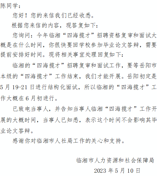 | 标题: | 您好,请问今年临湘“四海揽才”招聘资格复审和面试大概是在什么时间呢?我很快要回学校参加毕业论文答辩,需要提前安排好时间。望回复,谢谢。 |