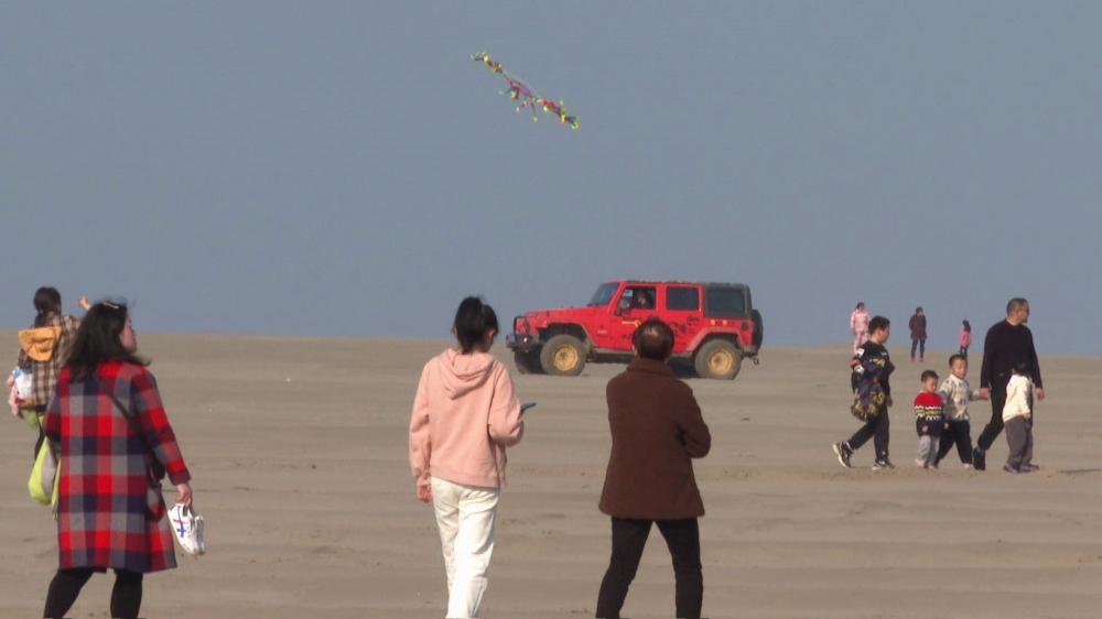 沙滩上,各种形状的小水洼星罗棋布,宛如一面面镜子。在春日暖阳的照耀下,沙滩显得格外壮观,江水清澈、沙滩洁净,二者相互映衬,市民和游客在此休闲游玩,构成了一幅人与自然和谐共生的美好画面。