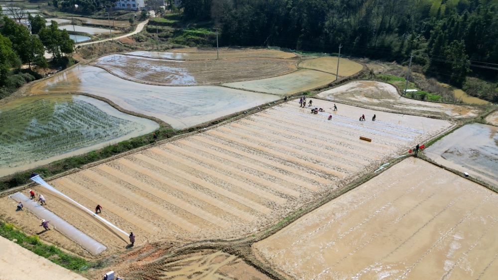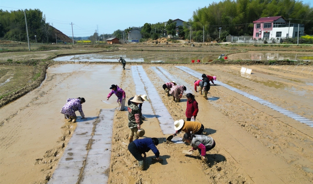 走进丁坊村集中育秧基地,只见村民们正忙碌在平整的秧田中,铺盘、覆泥、撒种、盖膜,一派繁忙而有序的劳动景象映入眼帘。