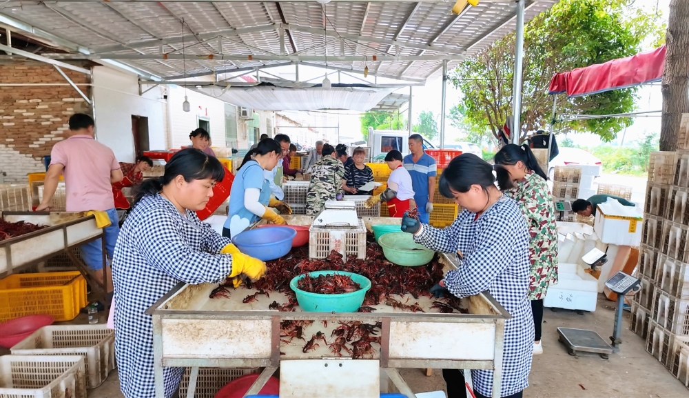 据了解,江南镇共有稻稻虾养殖面积5000亩,稻虾养殖面积4.3万亩,现在日均8万斤龙虾“爬”上各地餐桌,年产值预计突破1.5亿元。同时,该镇共建成60余个收购点,形成从养殖、分拣到冷链运输的完整链条。目前,全镇每天有600余名村民参与龙虾清洗、分拣,高峰期带动上千人就业,人均月收入超4000元。