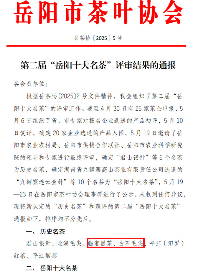近日,岳阳市茶叶协会通报第二届“岳阳十大名茶”评审结果,其中,我市白石毛尖被认定为“历史名茶”。