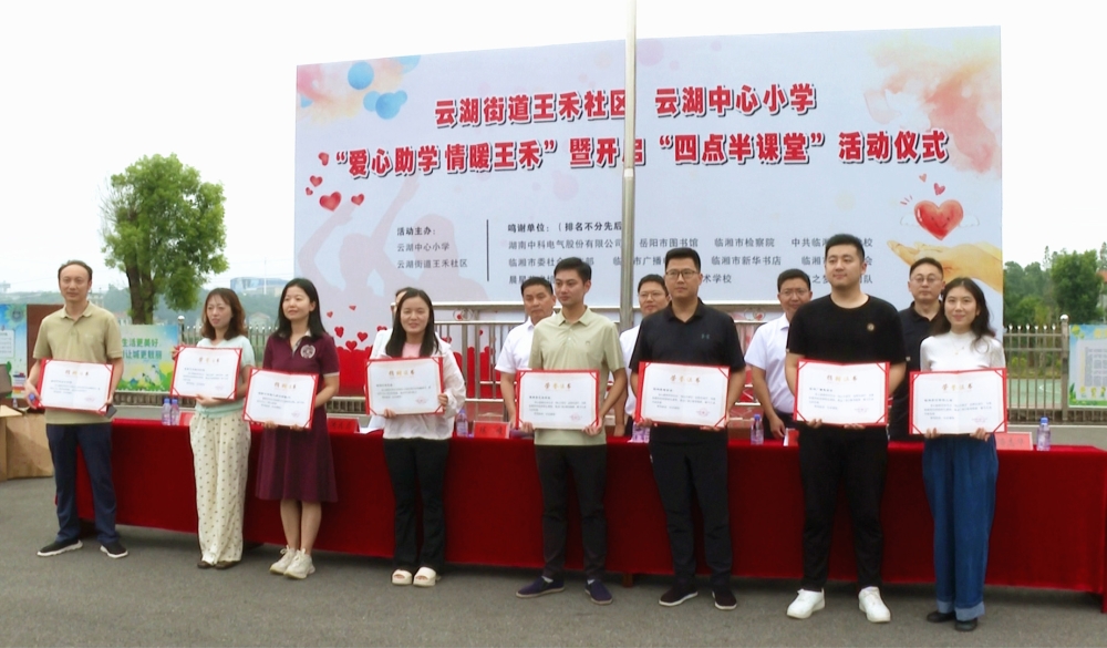 活动中,爱心企业湖南中科电气股份有限公司向云湖中心小学捐赠图书、书包、文具及体育用品,云湖街道王禾社区与云湖中心小学负责人向市融媒体中心、市新华书店、市篮球协会等爱心单位授予荣誉证书。