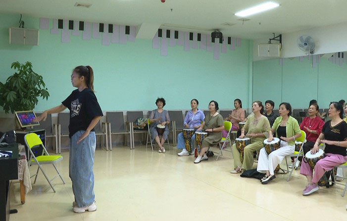 上午八点左右,在长安社区颐养中心文娱学堂内,一阵欢快的非洲鼓点声准时响起。今年62岁的学员袁金容正和伙伴们跟着节奏击打鼓面,脸上洋溢着灿烂的笑容。这家集多重服务于一体的智慧养老机构,正让越来越多像袁金容这样的老人,在退休后开启身心健康的新生活。