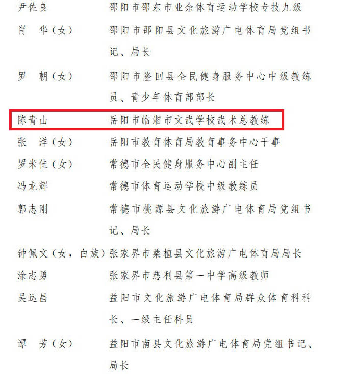 市文武学校武术总教练陈青山扎根基层推广武术运动,以文武学校为阵地,创新青少年武术教学模式,并深入校园、乡村进行公益授课,累计培养武术爱好者超2000人,同时助力学校向武汉体院、上海体院、成都体院等高校及省武术专业队输送专业人才160余人,培养国家健将级运动员2名,一级运动员4名,二级运动员200多名,成为全民健身骨干力量。