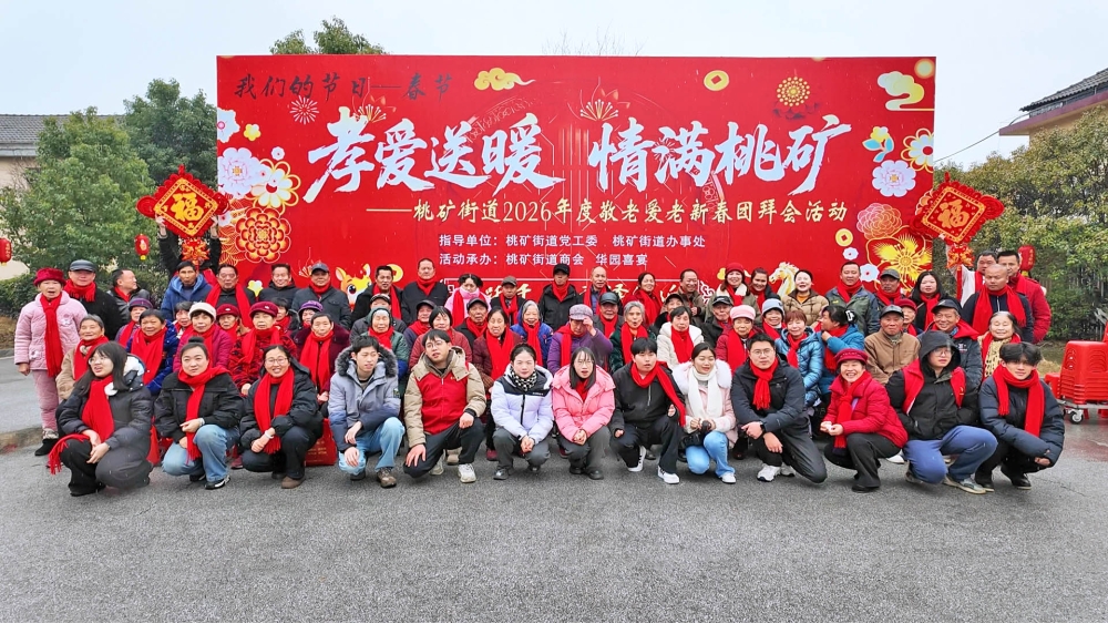 2月9日,桃矿街道复兴广场张灯结彩、暖意融融,一场以“孝爱送暖 情满桃矿”为主题的2026年度敬老爱老新春团拜会在此温情启幕。