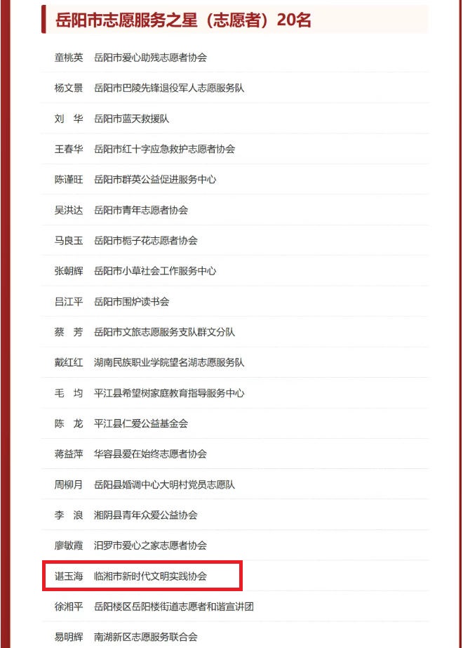 近日,2025年度岳阳市志愿服务先进典型评选结果正式公布,我市新时代文明实践协会谌玉海荣获岳阳市“志愿服务之星”个人称号,市巾帼创新创业协会李丽荣获岳阳市“志愿服务之星”工作者称号。