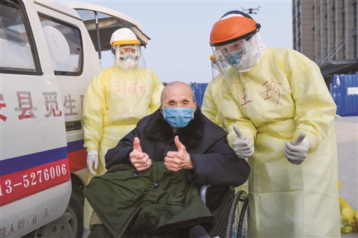 2月22日,湖北省黄冈市红安县中医院,90岁的夏爹爹为湖南医疗队点赞。当天,该市年龄最大的新冠肺炎确诊患者夏爹爹治愈出院。“谢谢湖南队,谢谢湖南队”,老人出院前为湖南医护人员点赞。湖南日报记者 辜鹏博 朱玉文 摄影报道