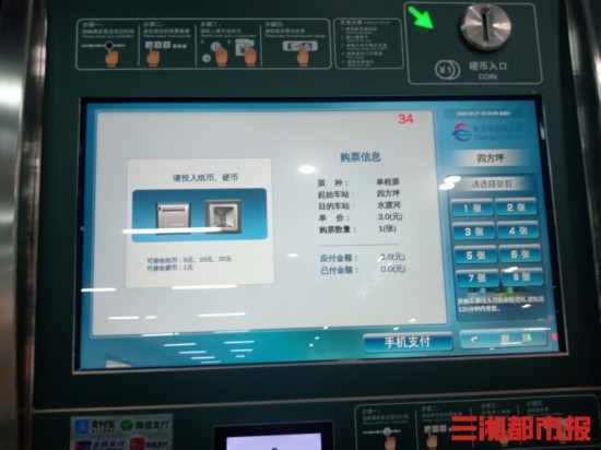 (长沙地铁3号线四方坪站,自动售票机提示可用5元、10元、20元的纸币,以及1元的硬币购票,购票系统显示一次性可购买8张票。记者 陈月红 摄)