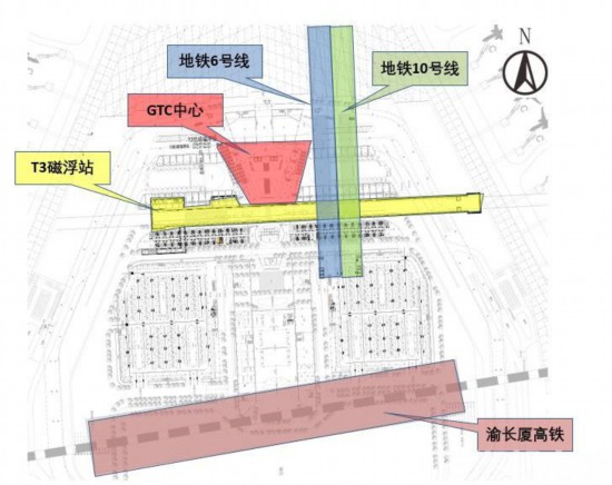 磁浮 T3 站可与地铁 6 号线、10 号线、渝长厦高铁换乘
