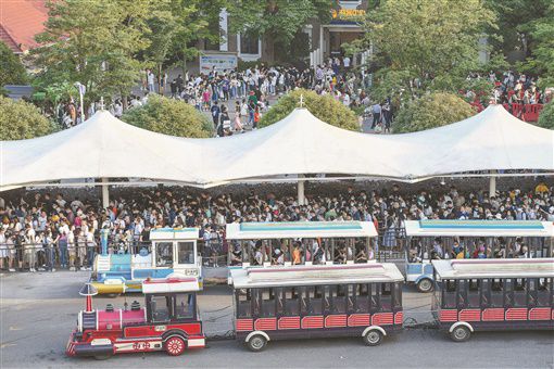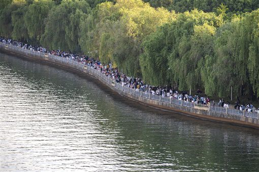 5月1日,长沙市橘子洲景区,等待乘坐观光车的市民和游客排起长队。记者 辜鹏博 摄