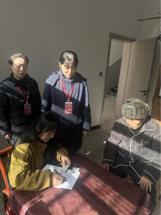 次日,两名工作人员驱车前往金盆村。他们仔细核对老人及代理人的身份证件与亲属关系证明,耐心询问老人的真实意愿,一步步指导家属填写授权委托书,全程细致讲解业务流程和后续注意事项。