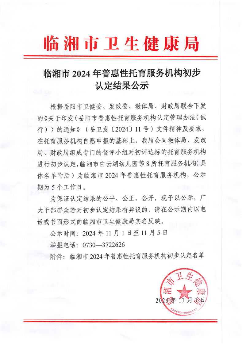 临湘市2024年普惠性托育服务机构初步认定结果公示