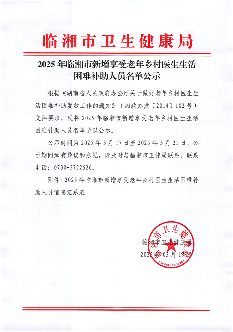 2025年临湘市新增享受老年乡村医生生活困难补助人员名单公示