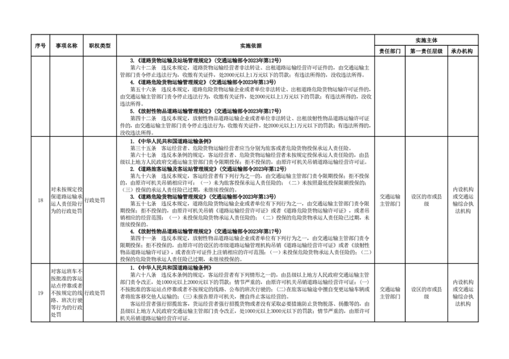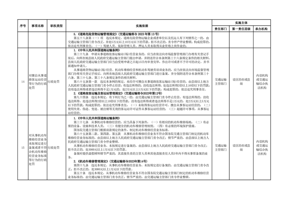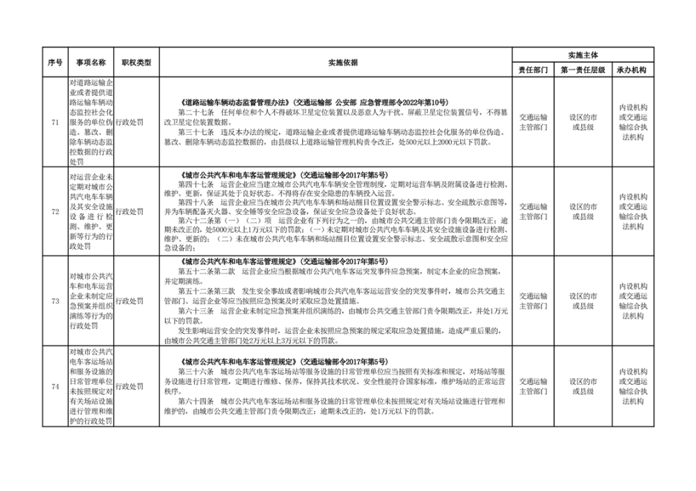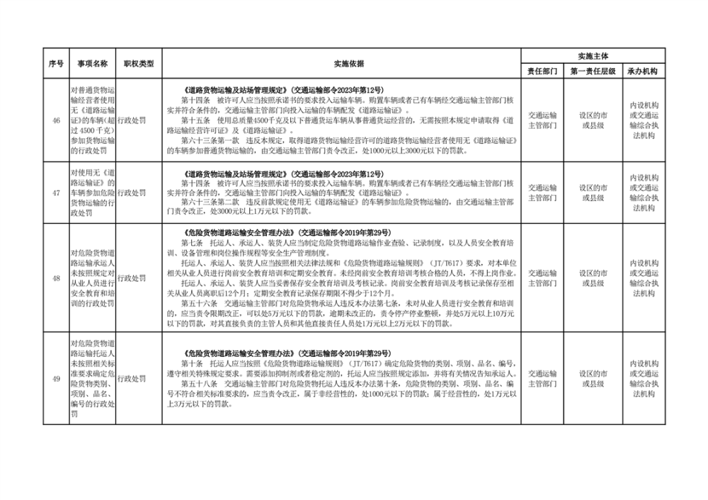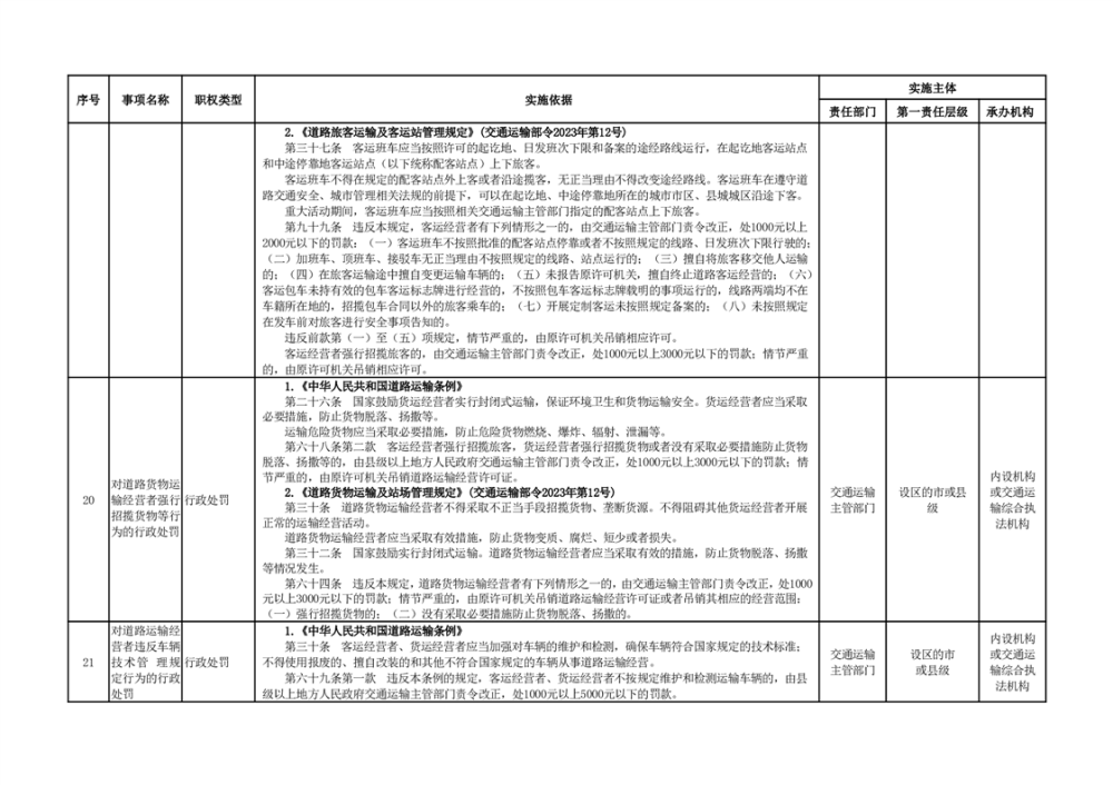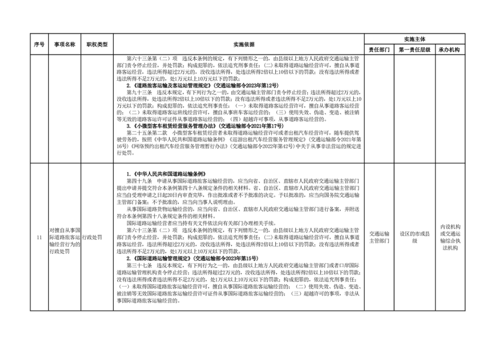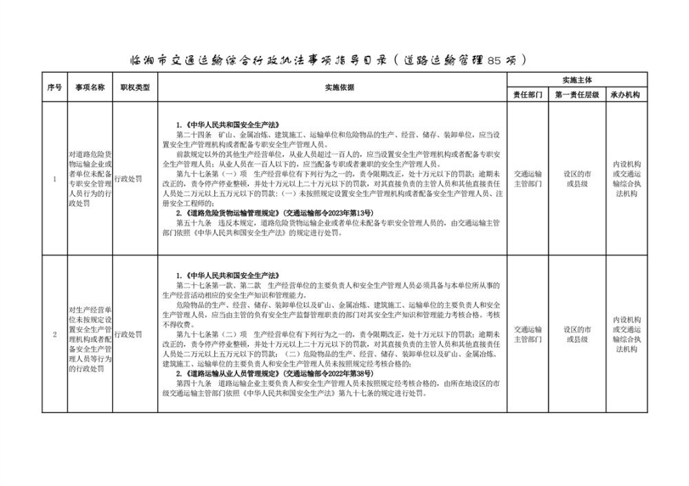 临湘市交通运输综合行政执法事项指导目录 道路运输管理85项