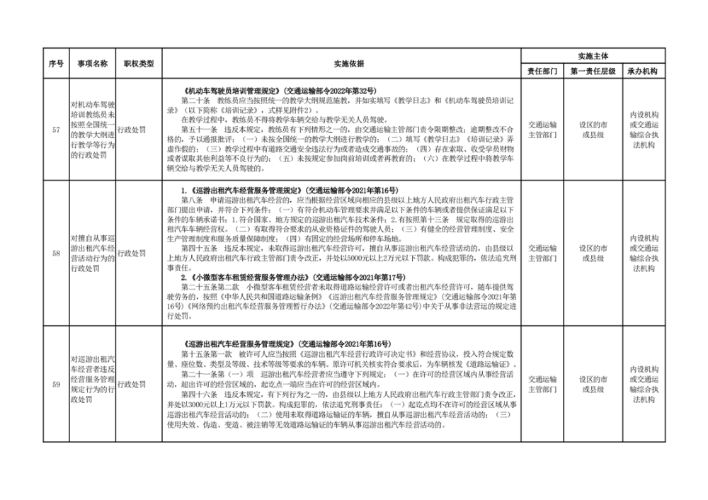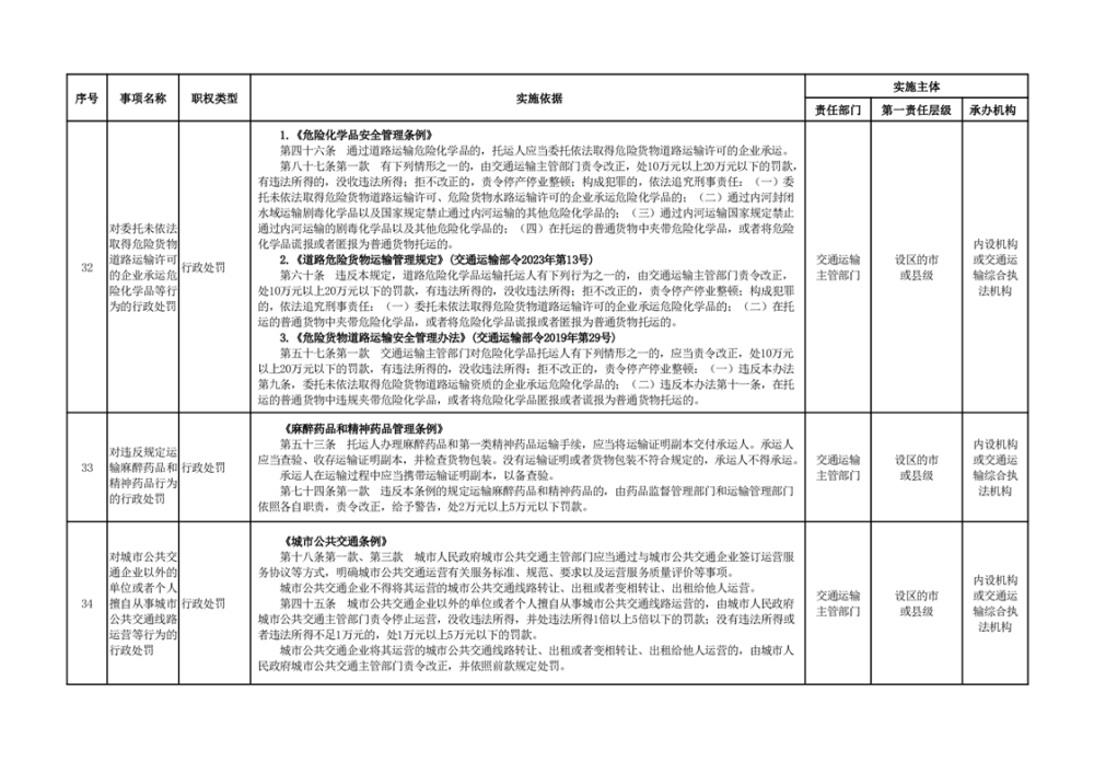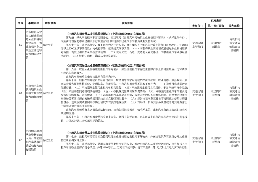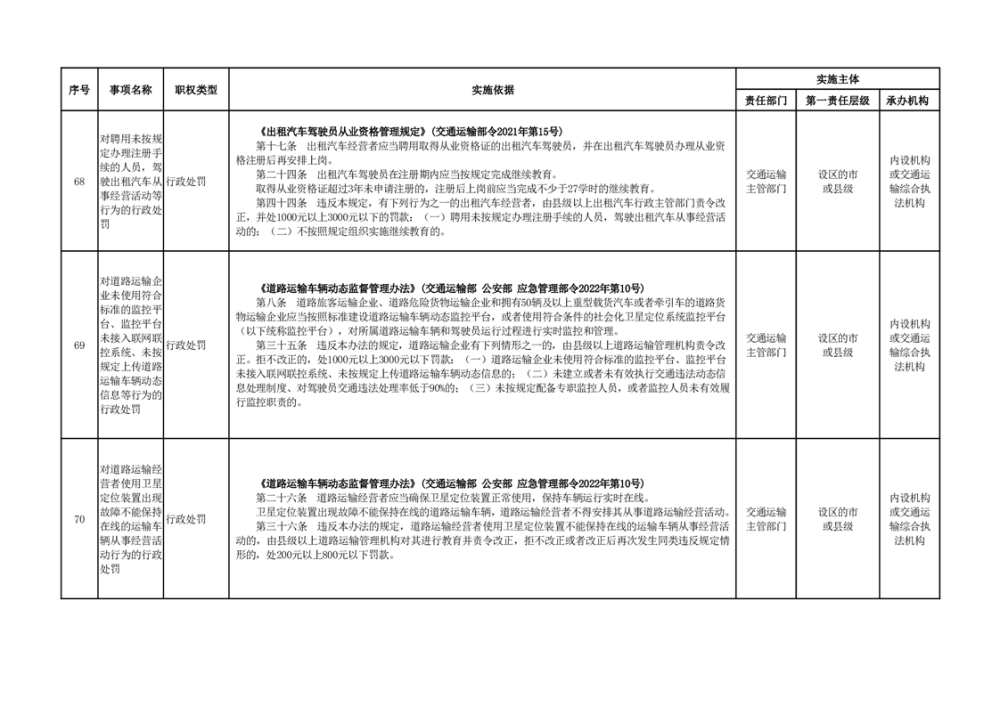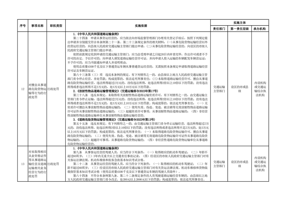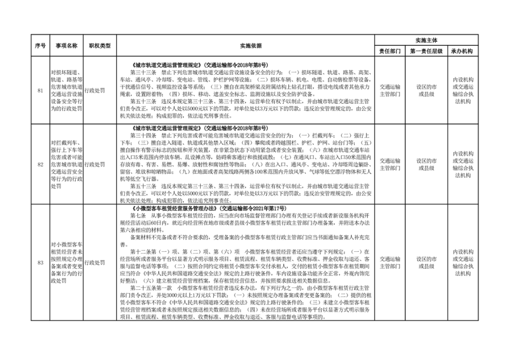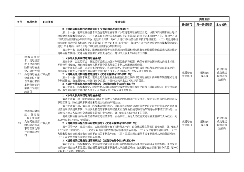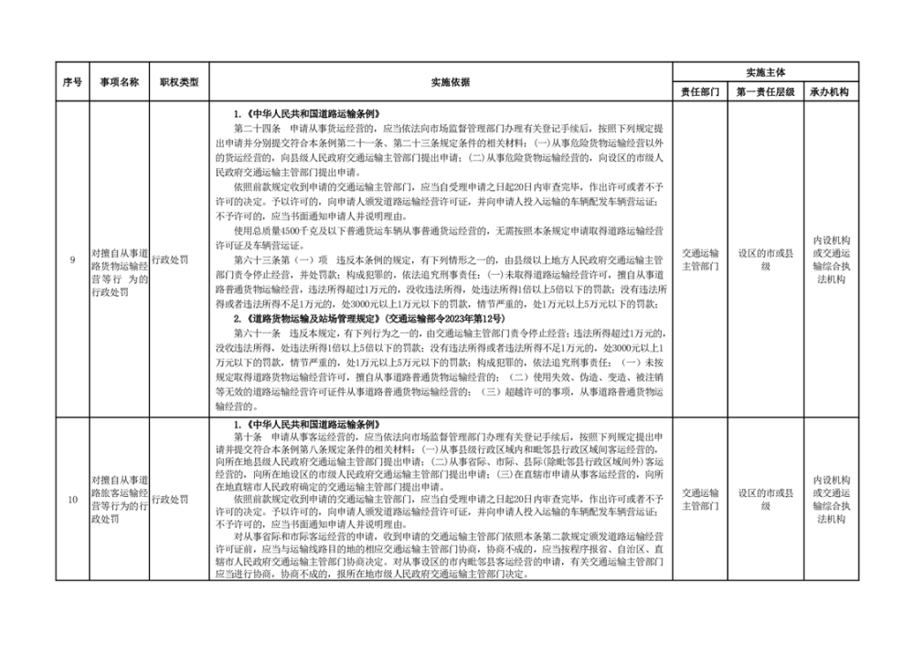 临湘市交通运输综合行政执法事项指导目录 道路运输管理85项