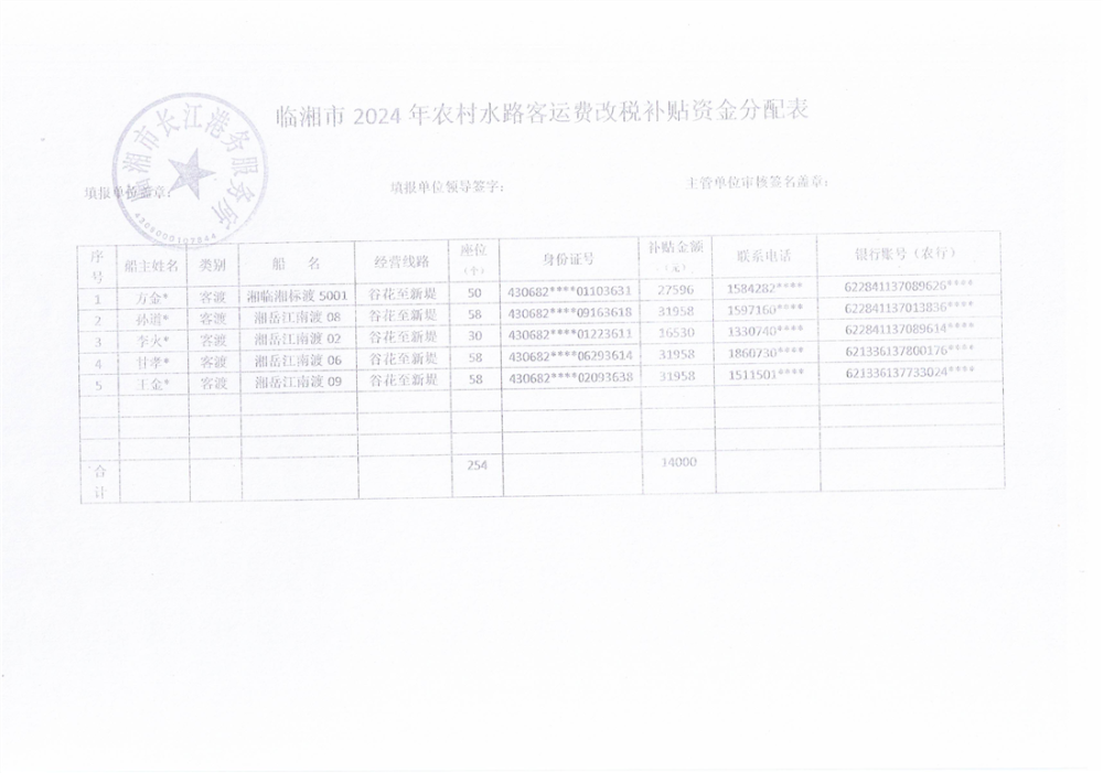 临湘市2024年农村水路客运费改税补贴资金分配表