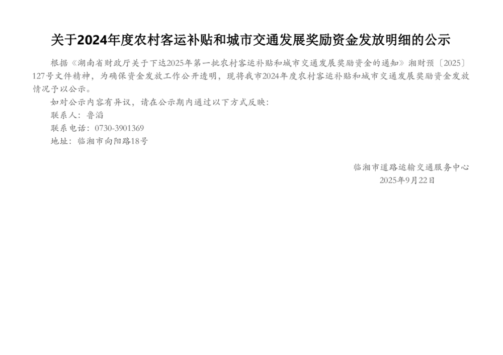 关于2024年度农村客运补贴和城市交通发展奖励资金发放明细的公示