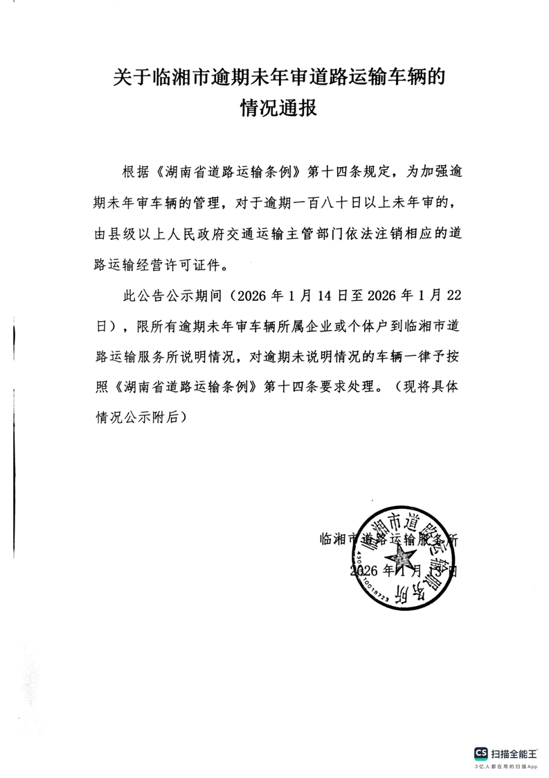 关于临湘市逾期未年审道路运输车辆的情况通报(2026)