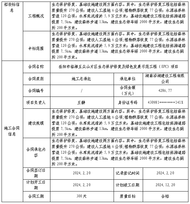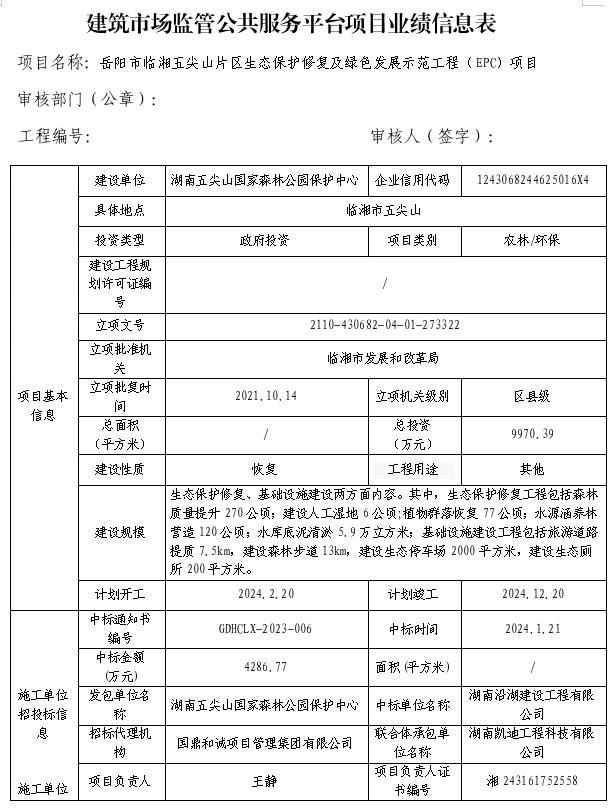 建筑市场监管公共服务平台项目业绩信息表-岳阳市临湘五尖山片区生态保护修复及绿色发展示范工程(EPC)项目