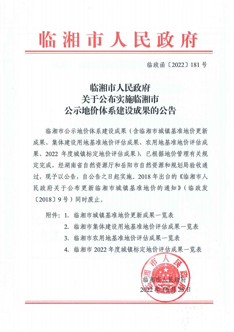 临湘市人民政府关于公布实施临湘市公示地价体系建设成果的公告
