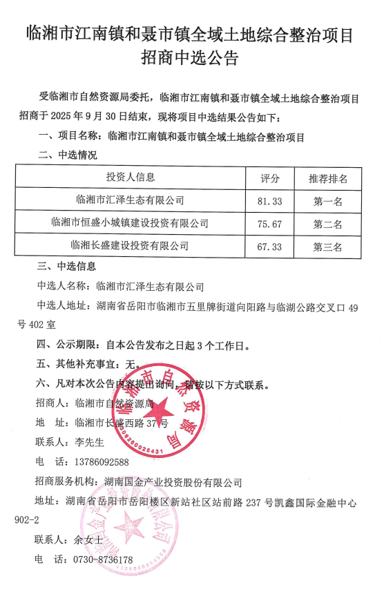 临湘市江南镇和聂市镇全域土地综合整治项目招商中选公告