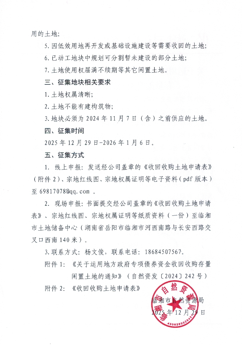 临湘市自然资源局关于运用地方政府专项债券资金收回收购存量闲置土地的征集公告