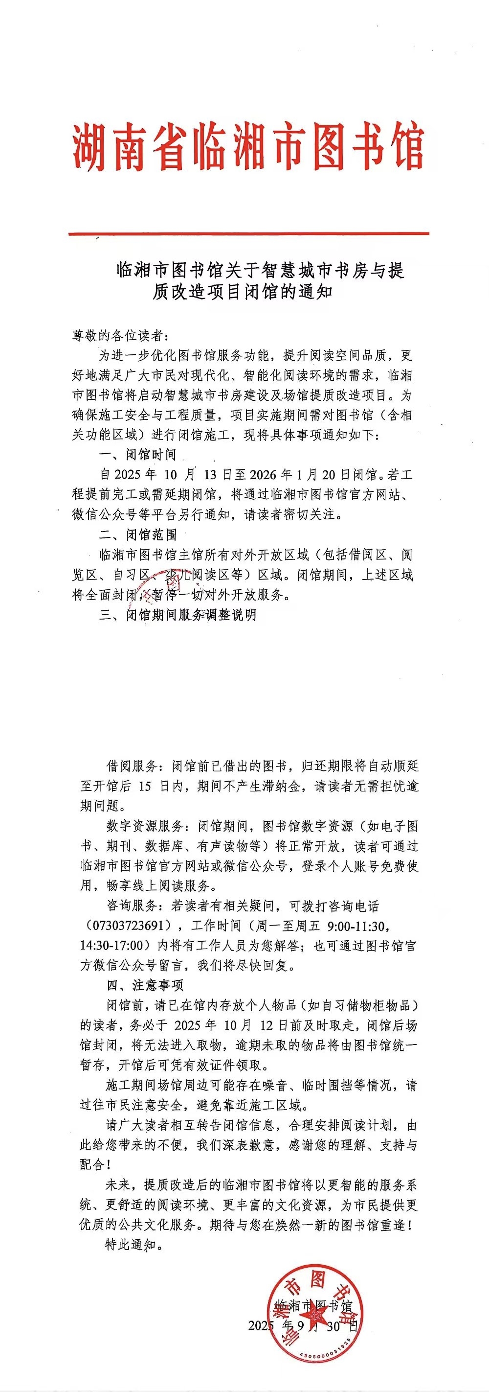 临湘市图书馆关于智慧城市书房与提质改造项目闭馆的通知