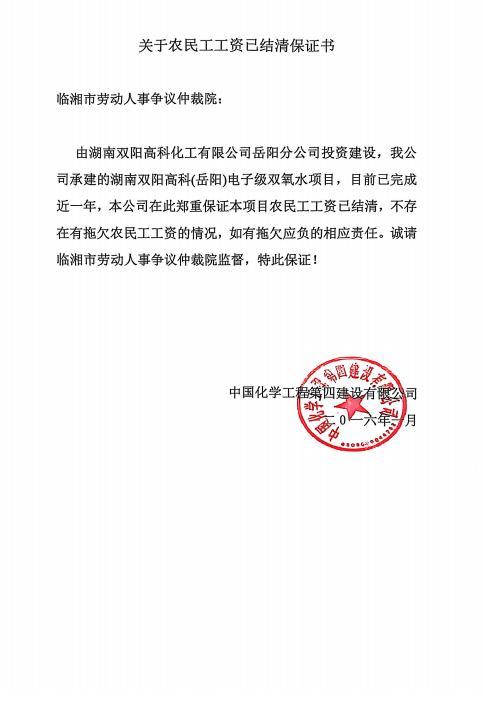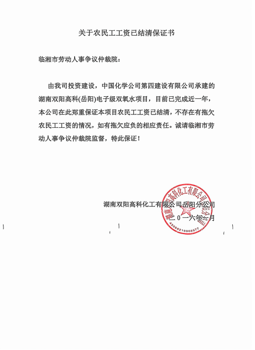 中国化学工程第四建设有限公司承建的湖南双阳高科化工有限公司岳阳分公司项目全部已完工,现向我局申请注销农民工工资专户。现根据《湖南省实施〈工程建设领域农民工工资专用账户管理暂行办法〉办法》(湘人社规〔2022〕3号)的要求,总包单位将本工程建设项目无拖欠农民工工资情况公示30日,并向项目所在地人力资源和社会保障行政部门出具无拖欠农民工工资承诺书,现将该公司承诺书公示如下: