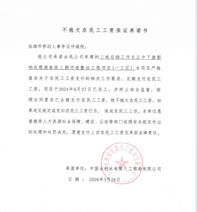 中国水利水电第八工程局有限公司承建的三峡后续工作长江中下游影响处理湖南段三期河道整治工程项目(一工区)全部已完工,现向我局申请注销农民工工资专户。现根据《湖南省实施〈工程建设领域农民工工资专用账户管理暂行办法〉办法》(湘人社规〔2022〕3号)的要求,总包单位将本工程建设项目无拖欠农民工工资情况公示30日,并向项目所在地人力资源和社会保障行政部门出具无拖欠农民工工资承诺书,现将该公司承诺书公示如下: