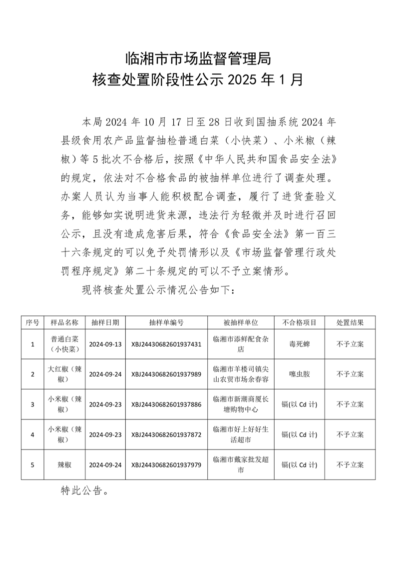 临湘市市场监督管理局 核查处置阶段性公示2025年1月