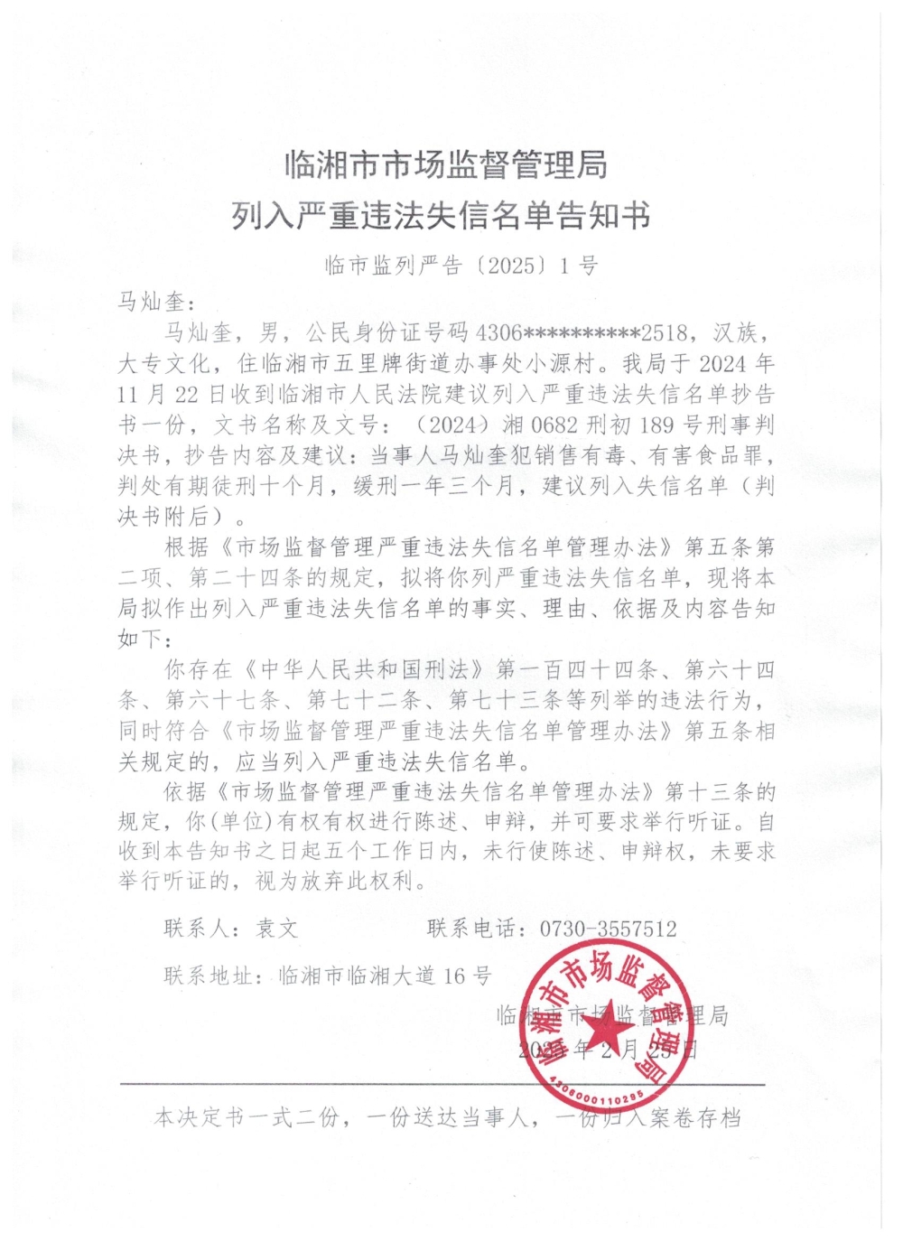 临湘市市场监督管理局列入严重违法失信名单告知书临市监列严告〔2025〕01