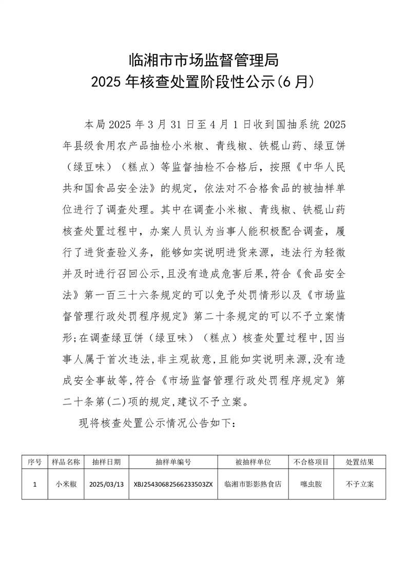 临湘市市场监督管理局 2025年核查处置阶段性公示6月