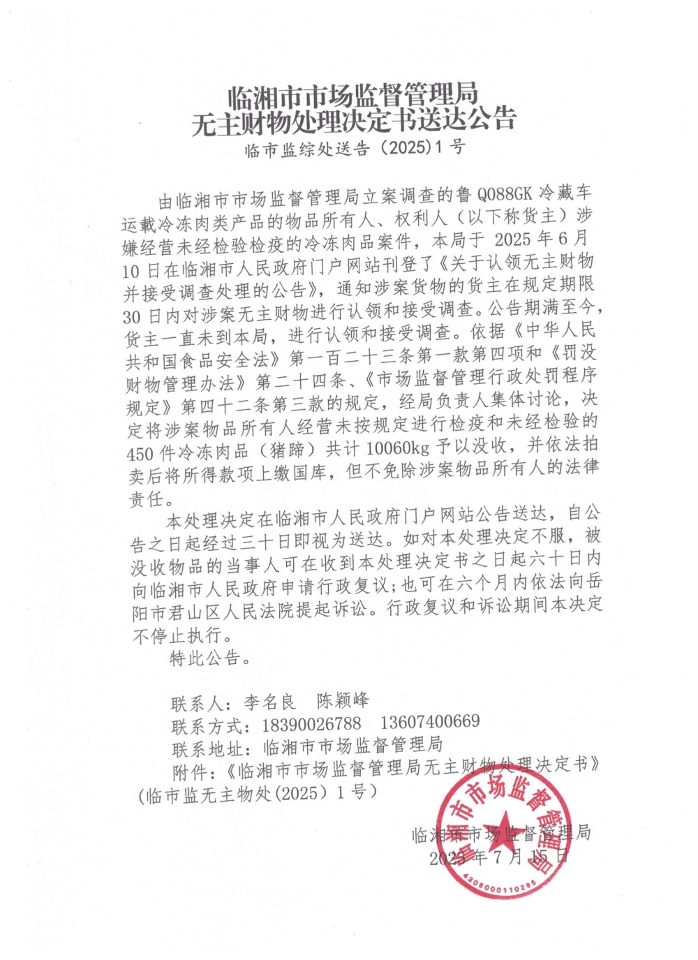 临湘市市场监督管理局无主财物处理决定书送达公告-临市监综处送告(2025)1号