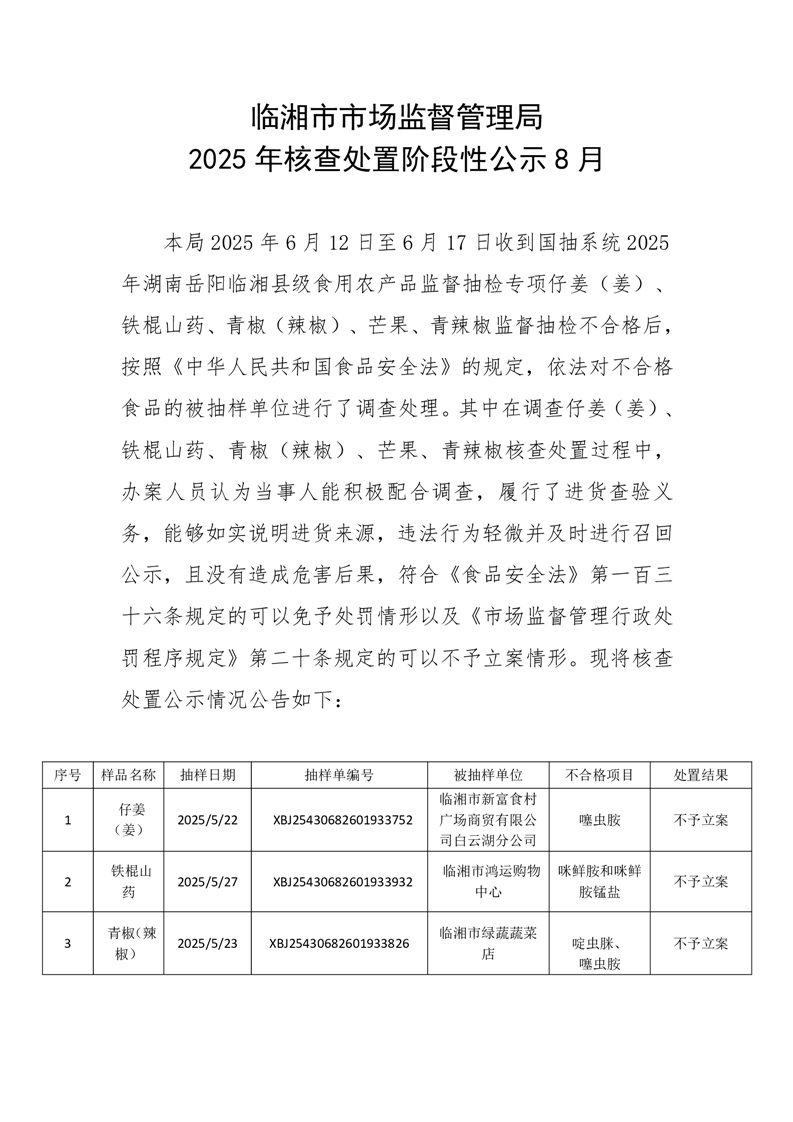 临湘市市场监督管理局 2025年核查处置阶段性公示8月