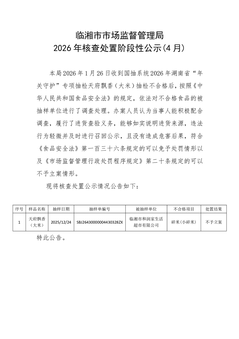临湘市市场监督管理局 2026年核查处置阶段性公示(4月)