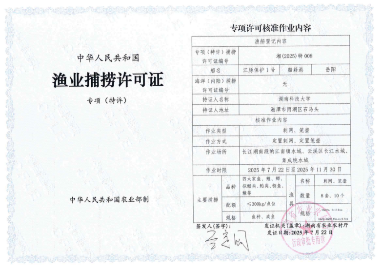 附件1:专项(特许)捕捞证-湘(2025)特008号
