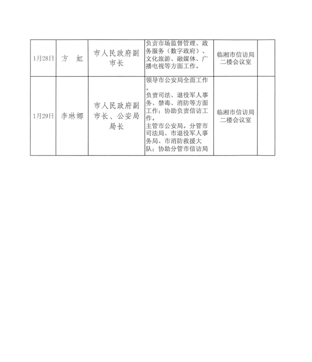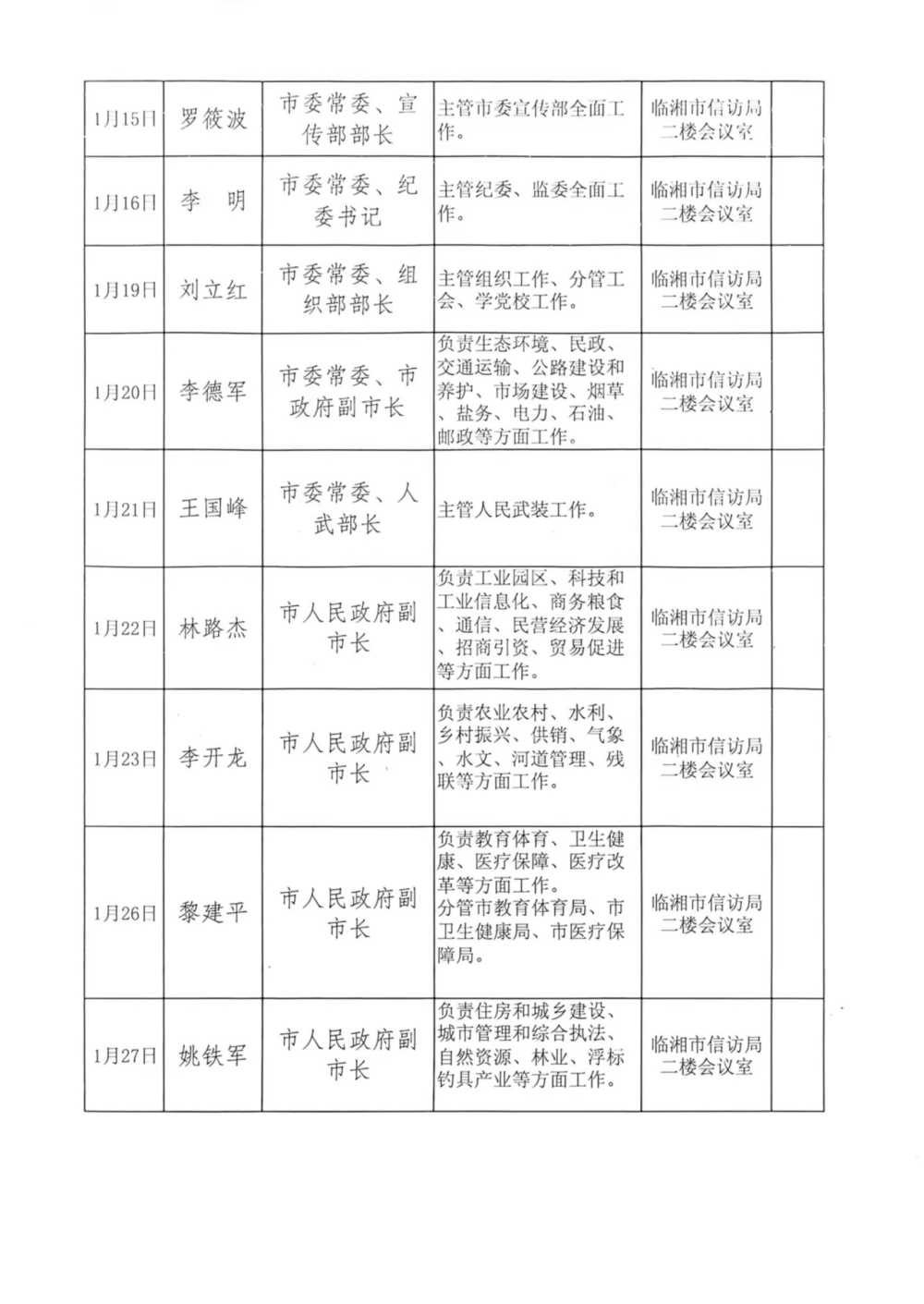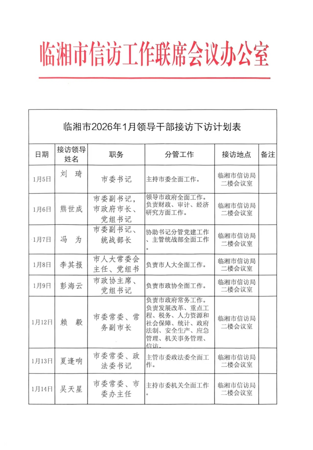 临湘市2026年1月领导干部接访下访计划表