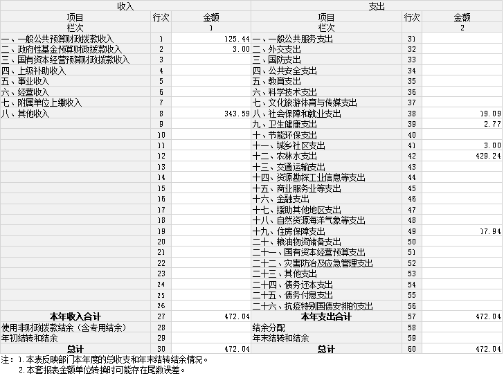 2024年度收、支总计472.04万元。与上年相比,增加88.38万元,增长18.72%,主要是原因上年其他收入资金没有计入决算。