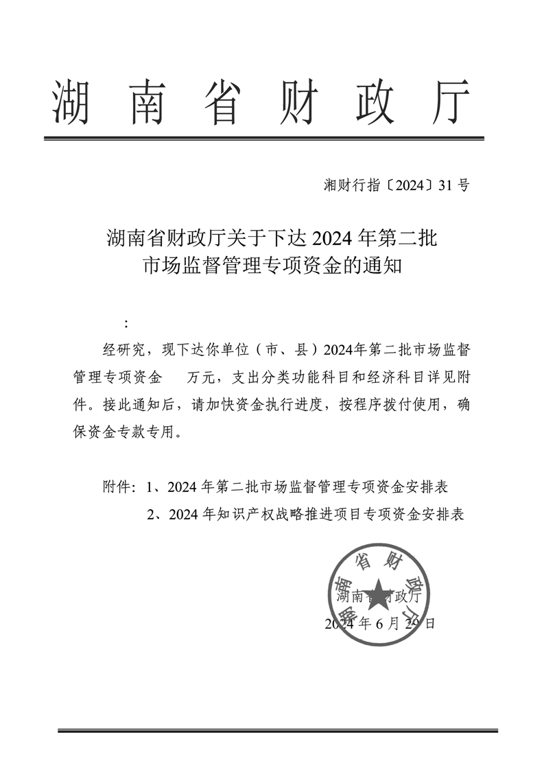 湖南省财政厅关于下达2024年第二批市场监督管理专项资金的通知