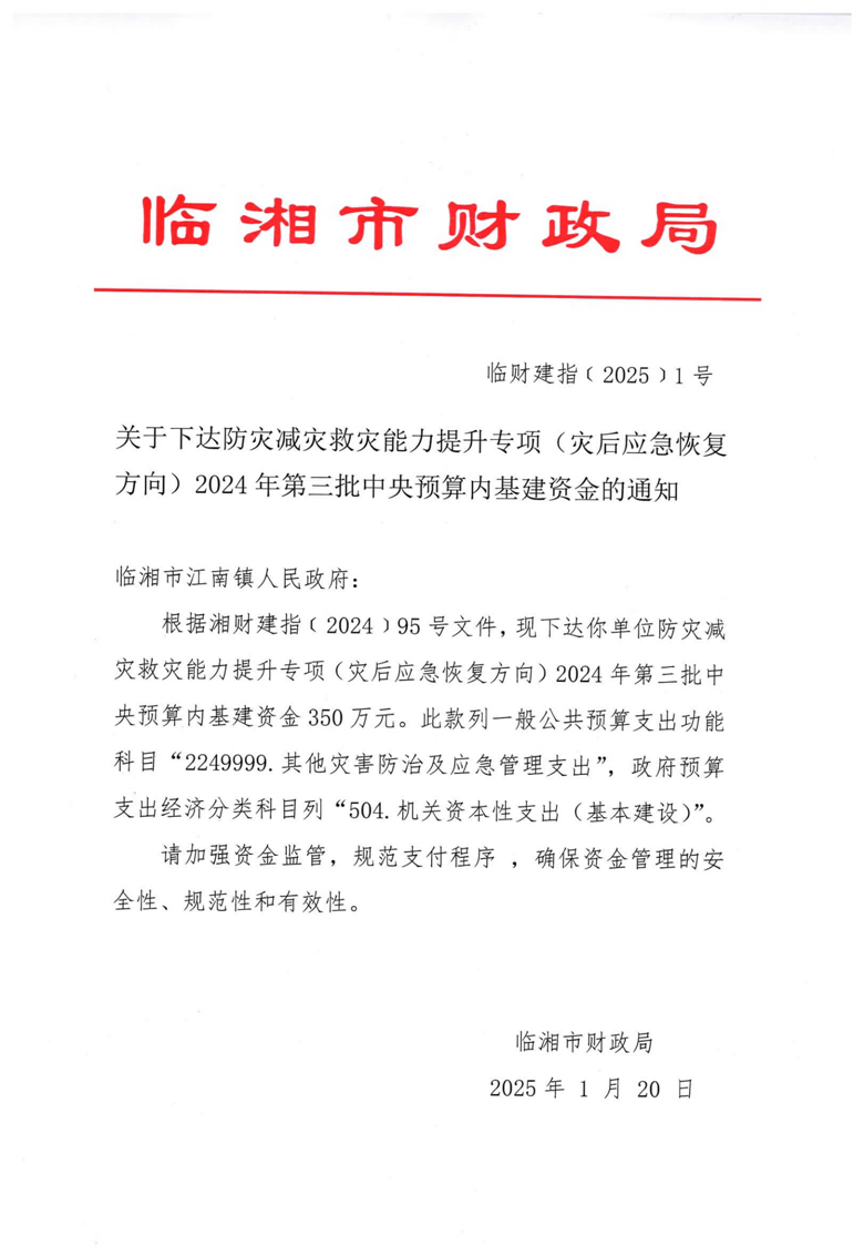 关于下达防灾减灾救灾能力提升专项(灾后应急恢复方向)2024年第三批中央预算内基建资金的通知