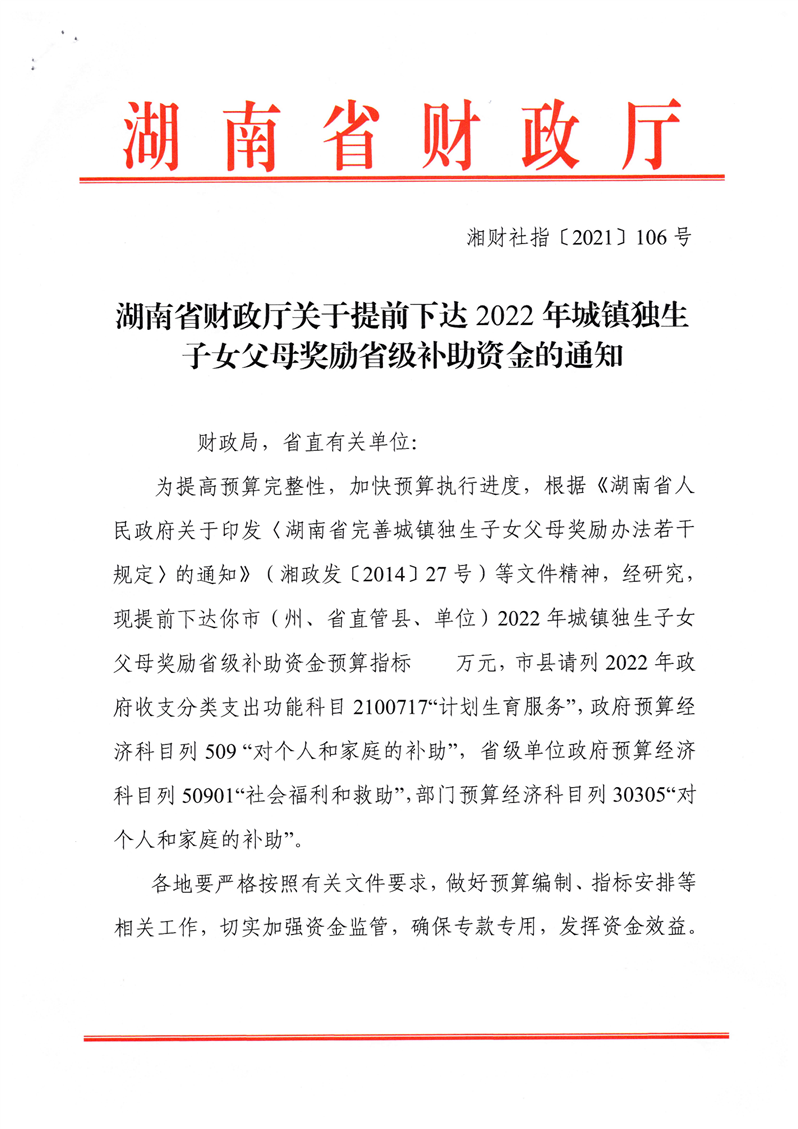 关于提前下达2022年城镇独生子女奖励省级补助资金的通知