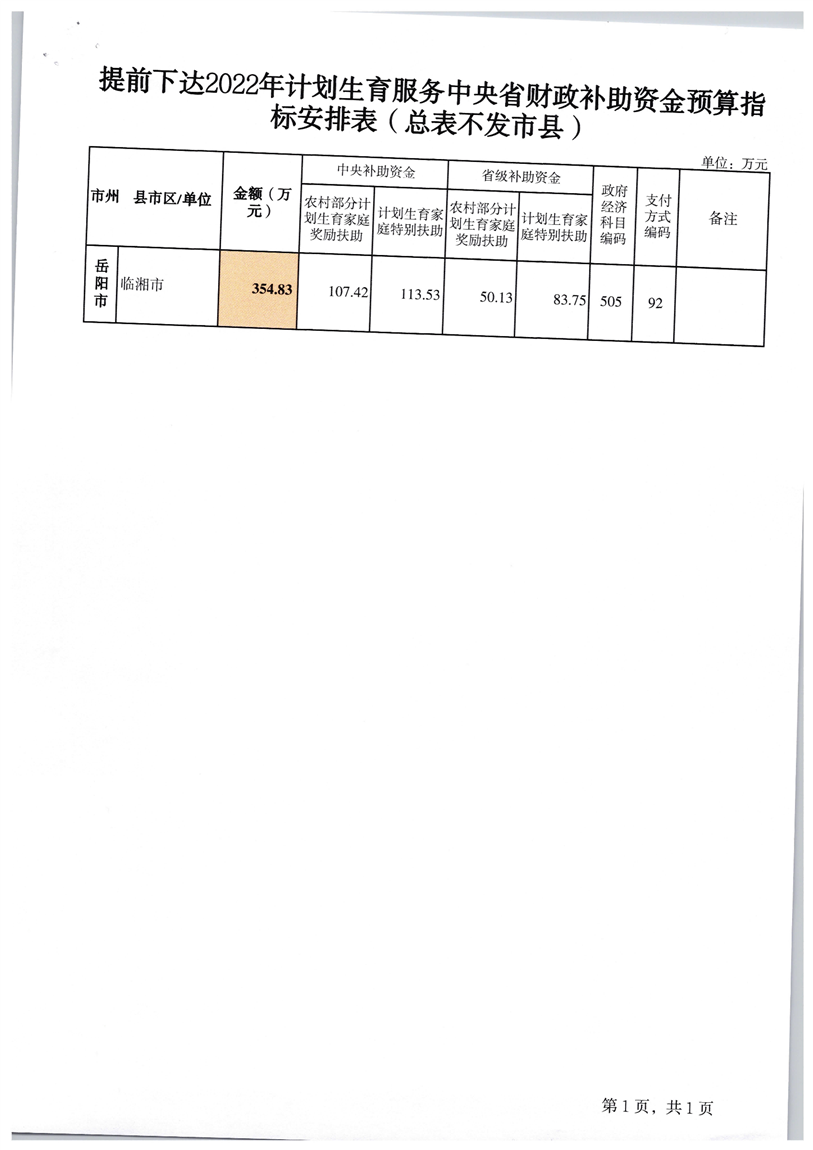 关于提前下达2022年计划生育服务中央和省财政补助资金预算指标的通知