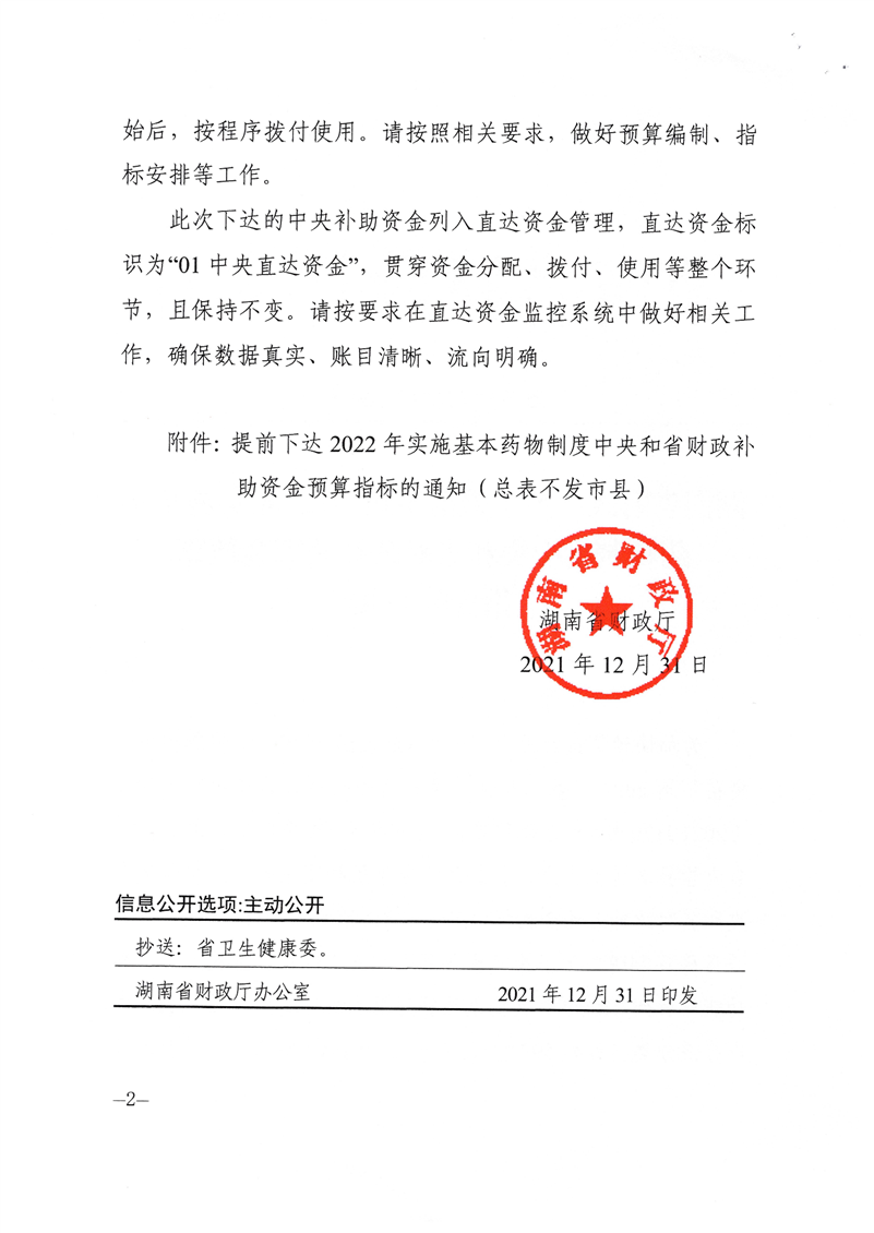 关于提前下达2022年实施基本药物制度中央和省财政补助资金预算指标的通知
