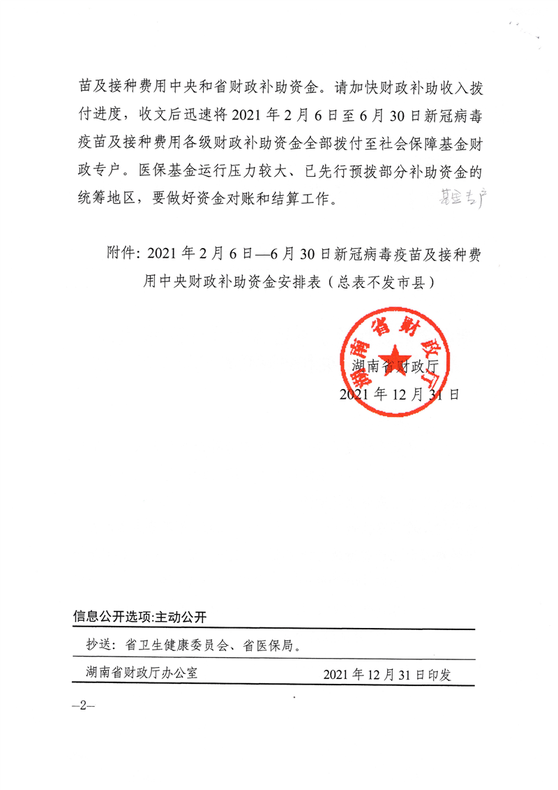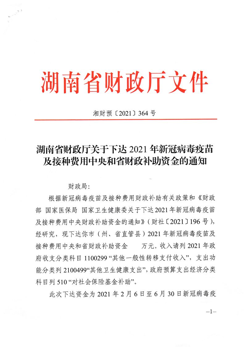 关于下达2021年新冠病毒疫苗及接种费用中央和省财政补助资金的通知