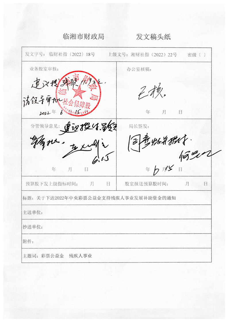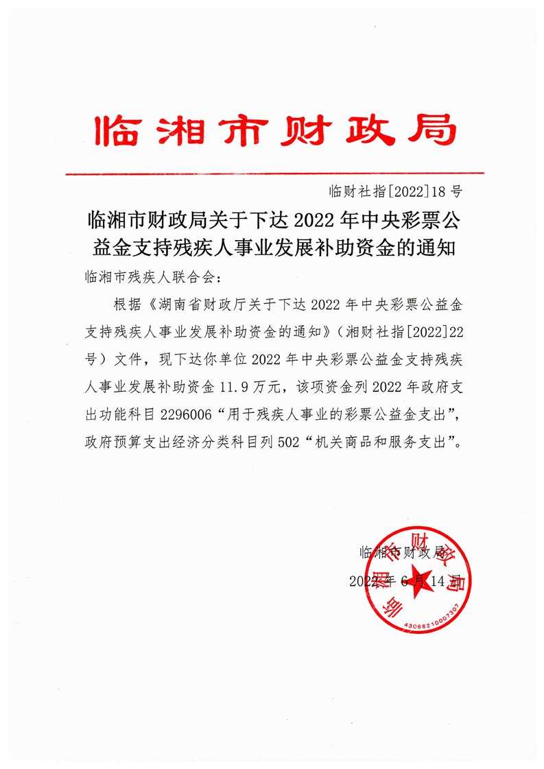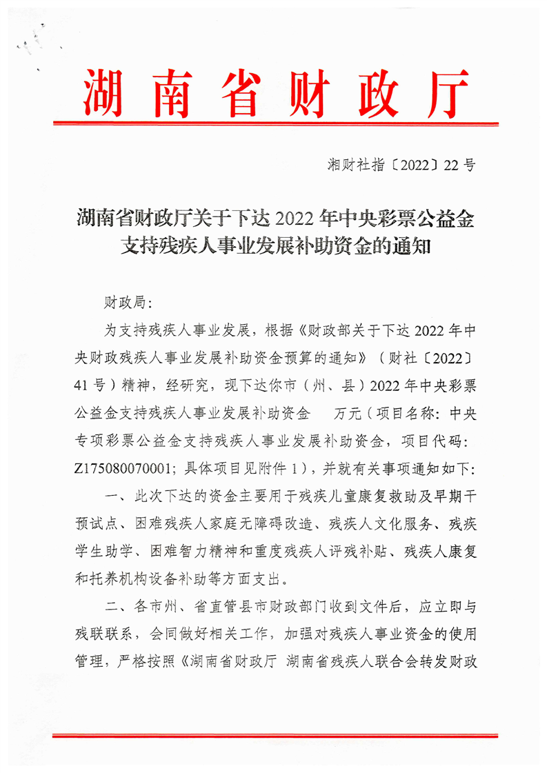 关于下达2022年中央彩票公益金支持残疾人事业发展补助资金的通知