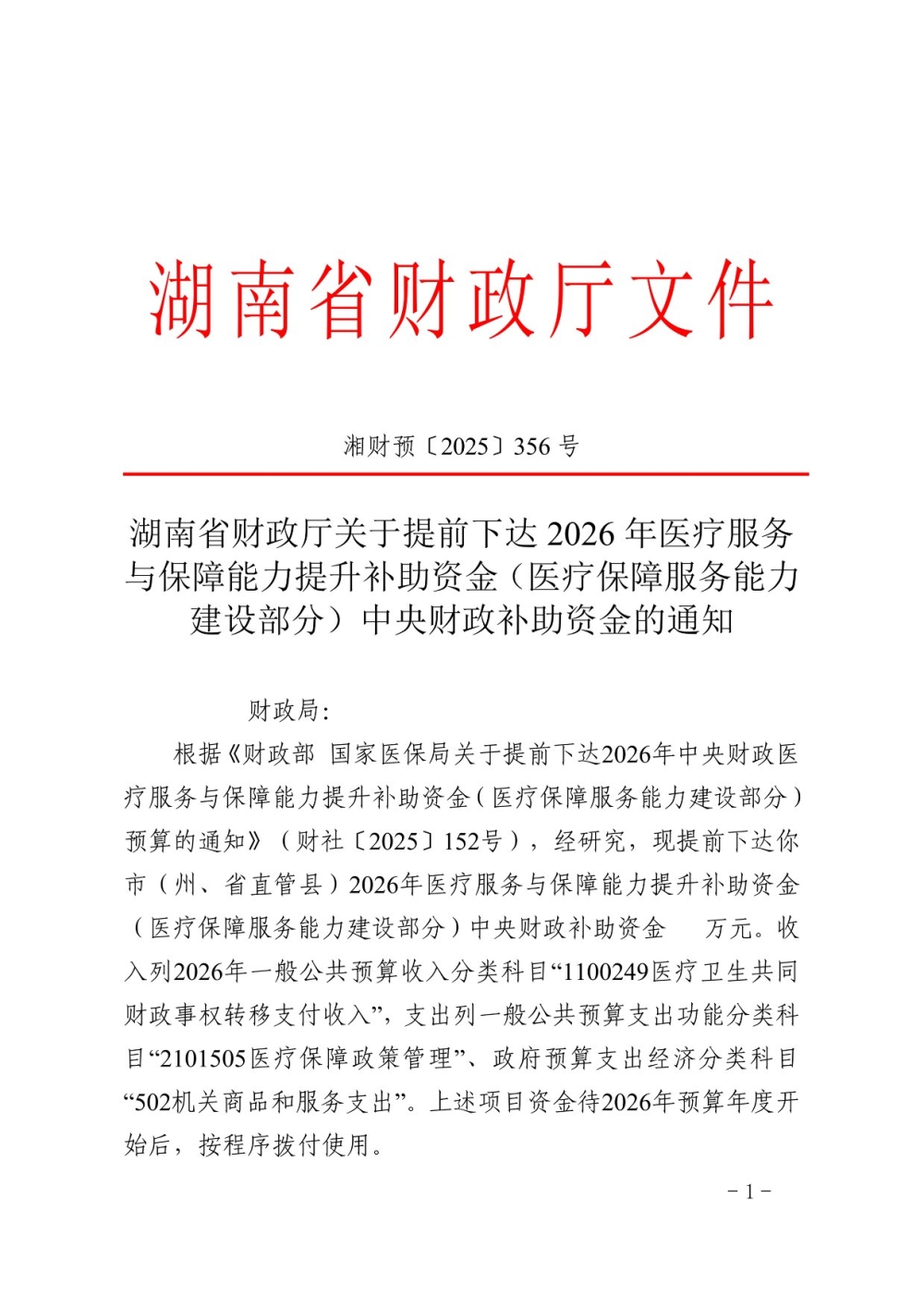 湖南省财政厅关于提前下达2026年医疗服务与保障能力提升补助资金(医疗保障服务能力建设部分)中央财政补助资金的通知