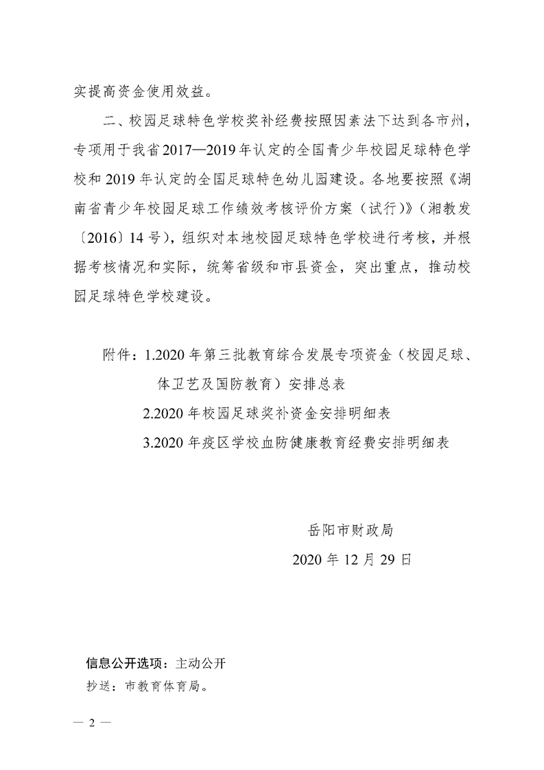 岳阳市财政局关于下达2020年第三批教育综合发展专项(校园足球、体卫艺及国防教育)资金的通知